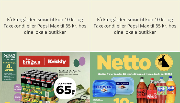 SuperBrugsen tilbyder Faxekondi eller Pepsi Max i flere varianter. Du kan få en pakke med 24 x 33 cl for kun 65 kr. pr. pakke. Der er en begrænsning på maksimalt 6 pakker pr. kunde. Tilbuddet gælder fra fredag den 27. marts til lørdag den 4. april.